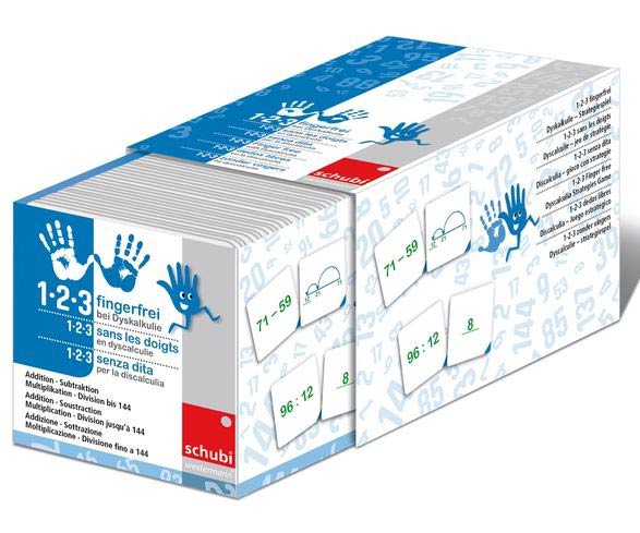 1-2-3 zonder vingers: Optellen, Aftrekken, Vermenigvuldigen, Delen tot 144 is een memospel dat helpt bij de automatisering van wiskundige bewerkingen.Dit educatief spel bestaat uit 100 kaartparen. Het is een memospel waarin kinderen op zoek gaan naar kaarten die bij elkaar horen. Met dit spel kunnen alle vier de basisrekenkundige bewerkingen diepgaand geoefend worden.De 1-2-3 zonder vingers spellen kunnen gebruikt worden als hulpmiddel bij dyscalculie.