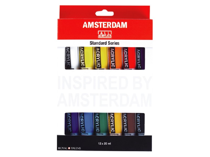 Set met 12 tubes (20 ml) acrylverf van de Amsterdam Standard Series. Je kunt de kleuren puur gebruiken, maar je kunt ze ook onderling mengen. De veelzijdige verf heeft een uitstekende lichtechtheid dus de kleur blijft, ook na tientallen jaren, net zo mooi is als op de dag dat jij hem hebt aangebracht. Afhankelijk van de kleur is de verf volledig dekkend, half-transparant of transparant. Je kunt de verf met water verdunnen en je kunt je penselen gewoon met wat water schoonspoelen. Na drogen lost de verf niet meer op in water en kun je hem (eventueel) vernissen of versieren met glitters, steentjes, stift, enz. Acrylverf is geschikt voor verschillende ondergronden. Een schildersdoek of acrylpapier ligt natuurlijk voor hand, maar je kunt bijvoorbeeld ook denken aan het decoreren van wanden, gebruiksvoorwerpen en andere 3D objecten. Probeer het maar eens uit op een fotolijstje of een bloempot! Dunne lagen zijn binnen een half uur droog, dus je kunt lekker snel doorwerken. Inhoud: In de