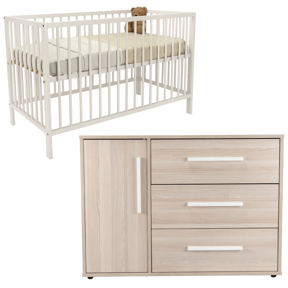 Babykamer Noah XL met Meegroei Ledikant Luca V2 (Commode + Ledikant) Meegroei Ledikant Laat je kindje heerlijk slapen met meegroei ledikantje Luca V2! Dit bedje kan de eerste jaren gebruikt worden als ledikantje. Zodra jouw kindje zelfstandig rechtop kan zitten, kun je de bodem verlagen. Als jouw kindje oud genoeg is om zelfstandig uit bed te komen, kun jeéén spijlenzijde vervangen voor de juniorvariant: veilig met uitvalbeveiliging zodat je kindje niet zomaar snachts uit bed rolt, maar wel zelf uit het bedje kan stappen.  Luca heeft een klassieke uitstraling met ronde spijlen en een eigentijdse look dankzij het gebruik van houten materialen. Commode De commode Noah XL is uitgevoerd in een naturel kleur en voorzien van houtkleurige lades met horizontale witte handgrepen. Daarnaast heeft de commode ruime opbergmogelijkheden, namelijk 3 lades en 1 deurtje met daarachter een hangroede om wat kleding van je kleintje op te hangen. De commodeis een mooie toevoeging voor aan de babykamer. Eigenschappen Meegroei Ledikant Merk: Colorfull Home Matrasafmeting: 60×120 Geschikt als ledikant en peuterbedje Inclusief juniorbed zijde Commode Materiaal: meubelplaat met een fineer laag Afmetingen: 130 x 52,5 x 93 cm (LxDxH) Voorzienvan 3 lades en 1 deurtje met hangroede