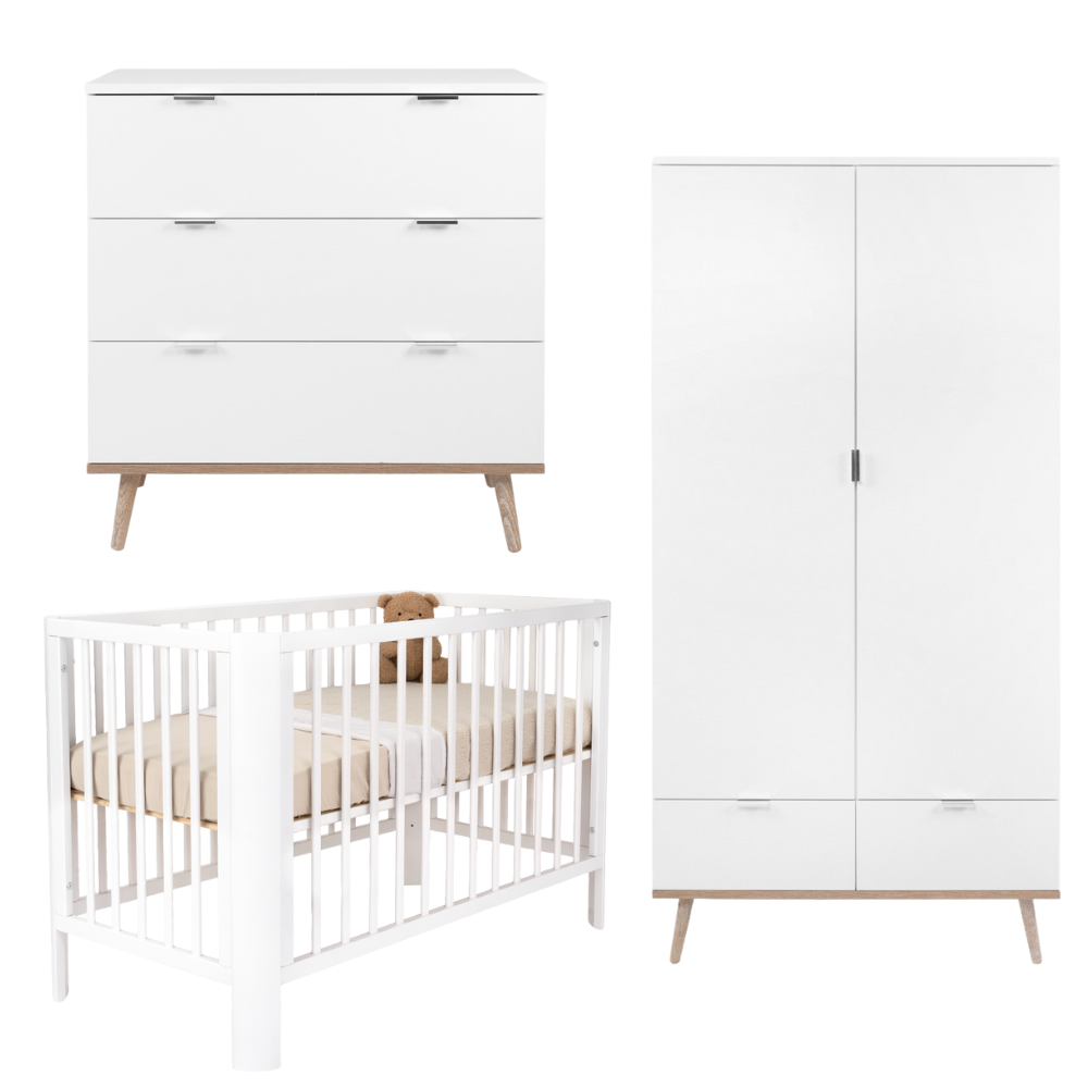 Babykamer Finori Göteberg 2-deurs kast met Ledikant Philou Ledikant Novi at Home Philou WhiteLedikant Philou is het perfecte ledikant voor in de babykamer en is al geschikt vanaf de geboorte. Het ledikant is extra veilig dankzij zijn afgeronde hoeken, dit geeft een strakke uitstraling en daardoor past dit ledikantin ieder interieur. Het ledikant is voorzien van platte spijlen en heeft een matrasmaat van 60×120 cm. Daarnaast is ledikant Philou gemaakt van MDF en is de bodem verstelbaar in 3 verschillende hoogtes. Dus zodra jouw kindje zich kan optrekken, kun je de bodem verstellen naar het laagste niveau. Door het uitvalrekje kan je kindje veilig slapen’s nachts. Commode Finori GötebergDe luxe commode Göteborg van Finori heeft een moderne en Scandinavische look. De Göteborg-collectie is een mix van naturel oak en strak wit. De commode is voorzien van 3 ruime lades en staat op schuine, ranke pootjes. De commode biedt voldoende opbergruimte en is leuk in te richten met bijvoorbeeld mandjes. Zo heb je altijd alles snel bij de hand tijdens het verschonen. 2-deurs Kast Finori GötebergDe luxe kast Göteborg van Finori heeft een moderne en Scandinavische look. De Göteborg-collectie is een mix van naturel oak en strak wit. De kast is voorzien van 2 deuren met daaronder 2 ruime lades en staat op schuine, ranke pootjes. Achter de 2 deuren zitten meerdere legplanken en een smalle hangroede. In combinatie met ruime lades biedt de kast genoeg opbergruimte en de mogelijkheid tot het inrichten van de kast. Eigenschappen Ledikant Novi at Home Philou White Merk: Novi at Home® Geschikt vanaf de geboorte Afmetingen: 63x123x80 cm (BxLxH) MatrasmaatL 60×120 cm Materiaal: MDF Bodem verstelbaar in 3 verschillende hoogtes Voorzien van afgeronde hoeken Met uitvalrek Commode Finori Göteberg Merk: Finori Materiaal: Spaanplaat Afmeting:79,8 x86,5 x 40 cm (bxhxd) Voorzien van 3 lades 2-deurs Kast Finori Göteberg Merk: Finori Materiaal: Spaanplaat Afmeting: 90x180x55 cm (bxhxd) Voorzien van 2 deuren en 2 lades