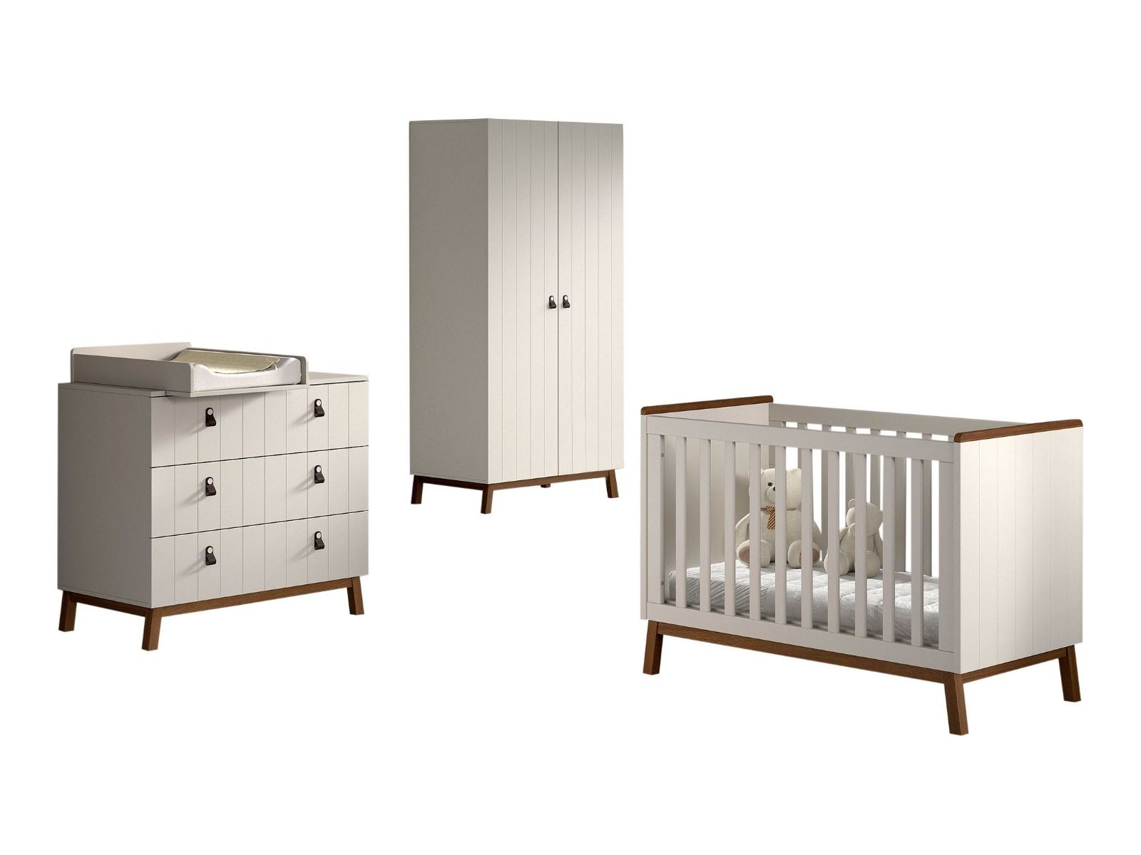 Babykamer Jaxx Sezane met 2-deurs kast Ledikant Dit stijlvolle ledikant is gemaakt van massief grenen en MDF. Het heeft een lichte klei kleur met walnootkleurige afwerking. Het bedje heeft een afmeting van 60 x 120 cm en de lattenbodem is in drie hoogtes verstelbaar. Zodra je kindje zelfstandig kan zitten, dient de lattenbodem naar beneden geplaatst te worden. Dit ledikant wordt geleverd exclusief matras, een passend matras is 60×120 cm. Commode Deze stijlvolle commode is geschikt voor elke babykamer. De drie grote lades geven genoeg ruimte om alle belangrijke babyspullen in op te bergen. De lederen handgrepen en walnoothouten details zorgen voor een stoere look. Heb je toch meer ruimte nodig op de commode? Er is een een bladvergroter verkrijgbaar voor deze commode. Hiermee kan je je kindje naar je toe verschonen en creëer je meer ruimte op de commode. Kast Kast Sezane van Jaxx is ideaal voor alle kleding van jouw kindje. Door de zes legplanken en een kledingroede is er genoeg ruimte om alle kleding in op te bergen. De kast heeft een zachte klei kleur, afgewerkt met walnoothouten details en lederen handgrepen.De kast is voorzien van soft-close, zo kan je geruisloos de kleding voor jouw kindje pakken. Is de kast toch een maatje te klein? Hij is ook leverbaar in een 3-deurs variant. Eigenschappen Ledikant Merk: Jaxx Afmetingen: 125 x 66 x 87 cm (LxBxH) Lattenbodem in hoogte verstelbaar Exclusief matras Geschikte matrasmaat: 60×120 cm Commode Merk: Vipack Afmetingen: 98x57x89 cm (BxLxH) Met drie ruime lades Met lederen handgrepen Bladvergroter apart verkrijgbaar Kast Merk: Vipack Afmetingen: 196 x 58 x 99 cm (HxBxL) Materiaal: Massief grenen&MDF Met 6 legplanken en 1 kledingroede Met lederen handgrepen Met soft-close