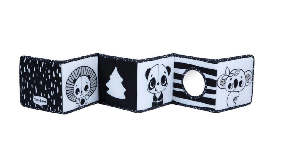 Boekje Tiny Love Double Sided Dit speelgoed boekje is van het merk Tiny Love. Het boekje heeft 2 zijdes waardoor er aan beide kanten wat te beleven valt. Het boekje is voorzien van verschillende texturen, elementen en illustraties. Hek boekje vouw je compact op en is daardoor ook nog makkelijk mee te nemen. TL Double Sided Book 3333111891 Black&White Decor