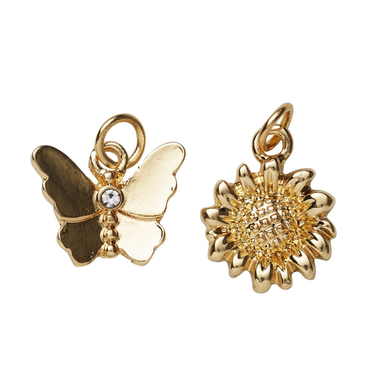 Mix&match verfijnde bedels voor unieke sieraden! Bedels en hangers zijn een must voor iedereen die houdt van oorbellen en armbanden die ze zelf hebben gemaakt. Deze elegante hangers zijn gemaakt van goudkleurig metaal en zijn prachtig gedetailleerd. Combineer de hangers met kettingen, ringen of oorbellen uit de Charms Collection, of met onderdelen uit onze sieradencollectie (https://pipoos.com/ontdek-je-hobby/sieraden-maken/). Vlinder van 12×10 mm met strass steen en zonnebloem van 12,5 mm, inclusief bijpassende buigring voor de bevestiging.
