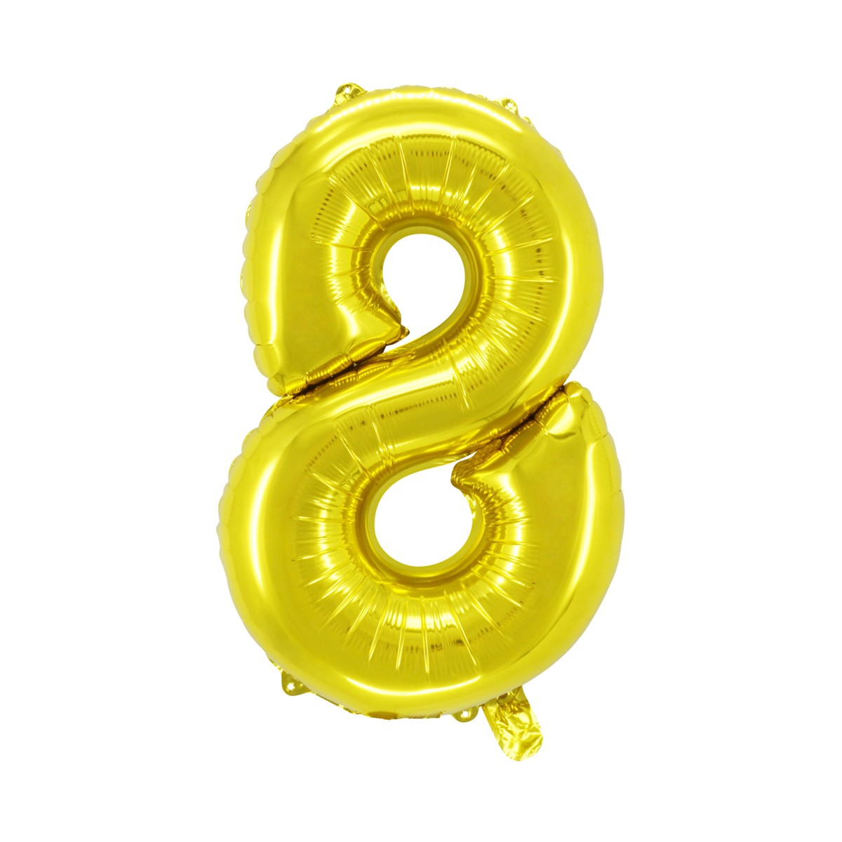 Niets zegt meer dan grote zwevende getallen als het gaat om een verjaardagsfeestje! Cijferballon van goudachtige metaalfolie van ca. 32 cm hoog. De ballon heeft kleine gaatjes om hem ermee op te hangen. Rietjes voor het opblazen inbegrepen en de ballon is voorzien van een zelfsluitend ventiel. De hele serie is ook verkrijgbaar in zilver. Onmisbaar bij verjaardagen, feesten, speciale gelegenheden of thema’s. Nummer 8.