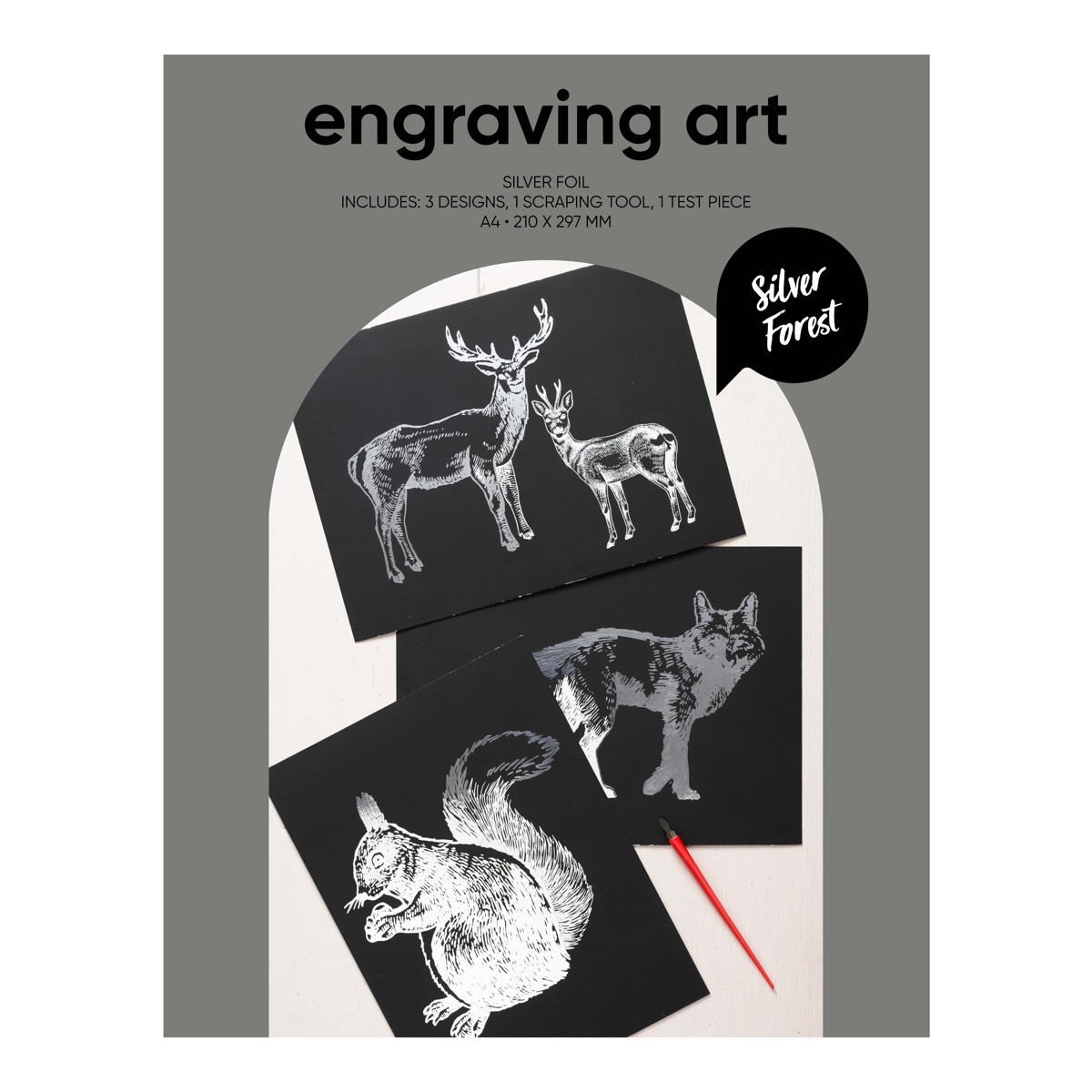 Engraving art, ook bekend als scraperfoil, scratch foil of krasfolie, bestaat uit een kartonnen plaat met daarop een zwarte laag. Onder deze laag zit een prachtige glimmende laag verstopt die je tevoorschijn tovert door er met een scherp voorwerp overheen te schrapen. Zo krijg je een prachtige tekening op een chique zwarte achtergrond. Oefen eerst op het bijgeleverde oefenkarton en bekijk goed hoe je het beste kunt schrapen voor het mooiste resultaat. Tevreden? Begin dan met de voorbedrukte tekening en tover ook deze tevoorschijn. Iedereen kan het! Doordat de schraper best scherp is, raden we het wel pas aan vanaf 8 jaar. En onthoud: je schraapt het zwarte materiaal weg en eenmaal weg, blijft het weg. Netjes werken dus! Leg bij voorkeur een printerpapiertje onder je hand, zo voorkom je olie- of zweetvlekken op het matzwarte oppervlak. Inhoud: 1 oefenkarton, 3 kartonnen platen op A4 formaat met voorbedrukte afbeelding en 1 schraper. De folie is zilverkleurig (op de foto lijkt het