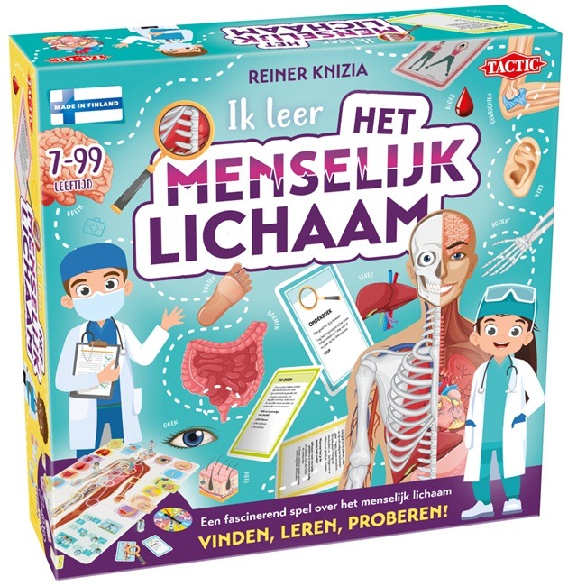 Een combinatie van leren, bewegen en plezierIn het spel Ik Leer Het Menselijk Lichaam van Tactic ontdekken kinderen spelenderwijs hoe het menselijk lichaam werkt, van top tot teen. Een perfecte combinatie van leren, bewegen en plezier!Tijdens het spel verplaatsen spelers hun pion over het spelbord en beantwoorden ze leuke en begrijpelijke vragen over het menselijk lichaam. Daarnaast voeren ze kleine oefeningen en opdrachten uit. Er zijn drie soorten uitdagingen: vinden, leren en proberen. Hoe beter je de opdrachten uitvoert, hoe sneller je vooruitgaat op het doktersparcours.Het doel is duidelijk: bereik als eerste het ziekenhuis en word de dokter! Maar pas op, want andere spelers proberen je natuurlijk voor te zijn. Zo blijft het spel spannend tot de finish.Waarom Ik Leer Het Menselijk Lichaam spelen?Educatief spel dat kennis over het menselijk lichaam vergroot.Interactieve opdrachten met vragen én beweging.Ideaal voor gezinnen en jonge ontdekkers.Ik Leer Het Menselijk Lichaam maakt leren leuk en actief. Stap in de rol van een dokter en ontdek al spelend hoe bijzonder het menselijk lichaam is!