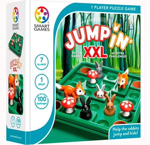 Jump’in XXL is niet enkel een grotere uitgave van het smart spel Jump’in. Jump’in XXL bevat een extra konijn en bestaat uit 100 verschillende opdrachten + oplossingen.Het spelprincipe van Jump’in XXL is om de konijnen te laten springen tot ze allemaal veilig in een hol zitten. De konijnen springen over andere konijnen, over paddenstoelen en over vossen. Vossen kunnen vooruit en achteruit geschoven worden. Deze actie is soms nodig om de konijnen in hun hol te krijgen.