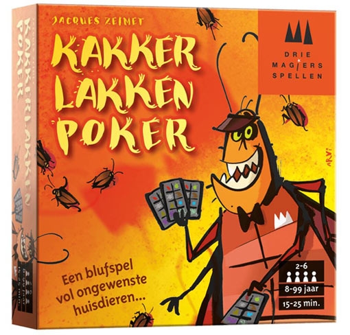Kakkerlakkenpoker is een eenvoudig blufspel. Bezorg de andere spelers zo veel mogelijk ongedierte! Er zijn spinnen, vleermuizen, kakkerlakken, wandluizen, ratten, padden, vliegen en schorpioenen.Bij het kaartspel Kakkerlakkenpoker schuift de actieve speler gedekt een kaart naar een andere speler. Hij benoemt het dier dat op de kaart staat, of hij bluft en noemt ƩƩn van de andere 7 dieren. De speler die de kaart ontvangt, mag zeggen of hij gelooft dat het dier op de kaart staat of niet. Hij mag er ook voor kiezen om de kaart te bekijken en ze dan door te schuiven naar een andere speler. Uiteindelijk komt de kaart te liggen bij wie fout gokt of bij de betrapte bluffer. Wie vier dieren van dezelfde soort voor zich heeft liggen, verliest het spel.Kakkerlakkenpoker is een heel grappig spelletje om te doen. Een vlieg kan doorgegeven worden en veranderen in een kakkerlak, om dan te eindigen als rat. Probeer jouw gezicht dan maar eens goed in de plooi te houden!
