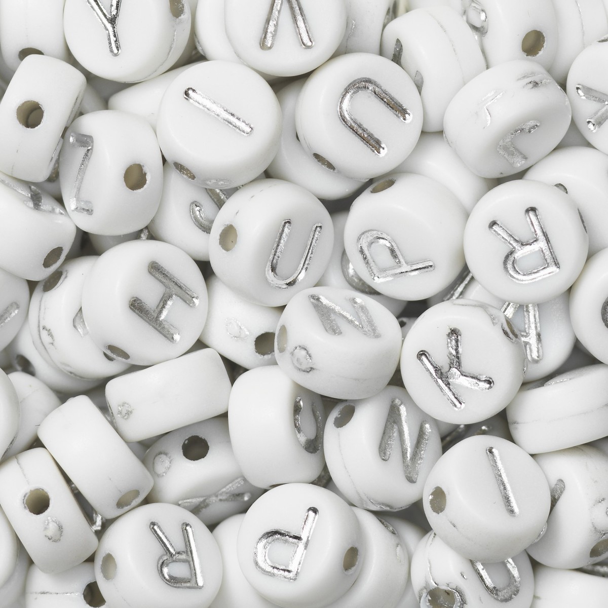 Iedereen die houdt van letterkralen met een mooie glans, steek je hand op! Hier is alles wat nodig is om met meterslange kettingen en armbanden alles te schrijven wat je je maar kunt bedenken. De kralen zijn klassiek wit met glanzende metallic letters, elegant en toch speels. De verpakking bevat ongeveer 130 kralen verdeeld tussen de letters A tot Z (willekeurige mix). De letterkralen hebben een diameter van 7 mm, een dikte van 4 mm en de diameter van het gat is 1,5 mm. Gemaakt van kunststof. Geschikt voor kinderen en volwassenen vanaf 3 jaar.