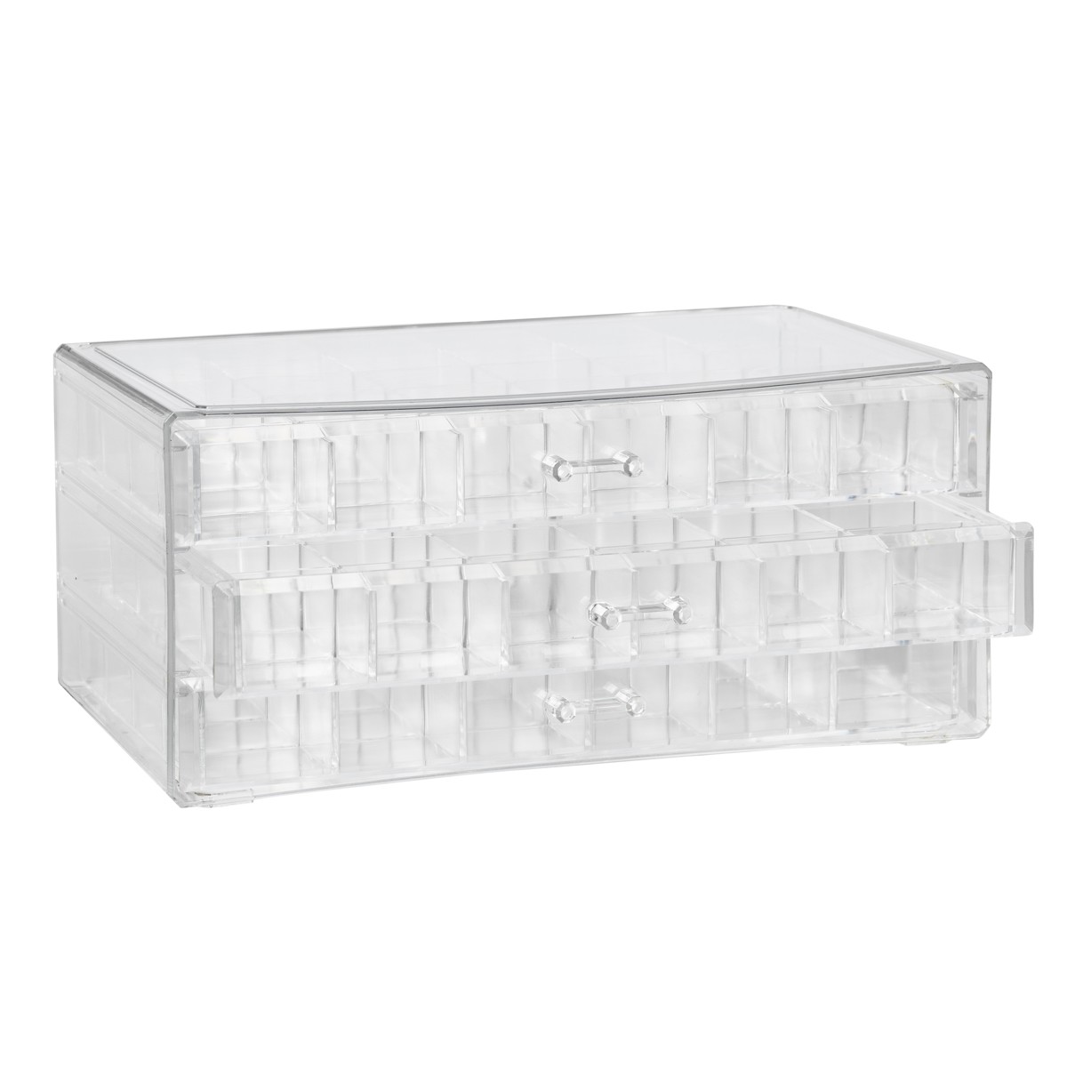 Praktische opbergruimte voor veel verschillende spullen, als ze maar niet groot zijn! Deze kleine ladekast heeft 3 uittrekbare lades met elk 24 kleine vakjes van 35x30x30 mm. Waar ga je de 72 vakjes mee vullen? Voor de hand liggend zijn natuurlijk kraaltjes en sieradenonderdelen, maar de invulling laten we natuurlijk aan jou. Omdat de lades transparant zijn, kun je precies zien wat erin zit en snel pakken wat je nodig hebt. Gemaakt van transparant plastic. Het kastje is 23,5x13x10,5 cm.