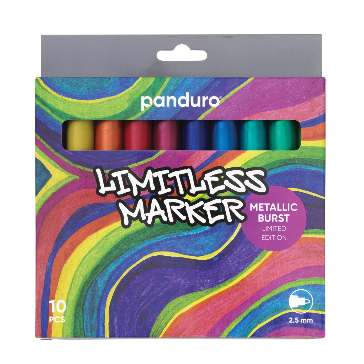 Limitless Markers: acrylpennen die kleur toevoegen aan alles! Limitless Markers zijn kleurrijke acrylstiften op waterbasis die zich niet laten begrenzen! De kleuren bedekken elkaar en eigenlijk alles wat je maar kunt bedenken. Denk hierbij aan ondergronden zoals papier, karton, canvas, steen, plastic, glas, keramiek, textiel en metaal. De pennen hebben een ronde punt, een zogenaamde bullet nib, die ongeveer 2,5 mm teken- en schrijfbreedte geeft (een beetje afhankelijk van hoe je de pen schuin houdt). Metallic Burst: deze limited edition set bevat 10 pennen in de metallic kleuren geel, oranje, rood, roze, paars, marineblauw, blauw, turquoise, woudgroen en bladgroen. De pennen horen niet bij de reguliere collectie en zijn daarmee een bijzonder collectors item! Werken met de pennen: Zorg ervoor dat de dop stevig op zijn plaats zit, schud de pen en hoor het rammelen! Als dit de eerste keer is of als het lang geleden is dat je de pen hebt gebruikt, moet je deze mogelijk 20 seconden