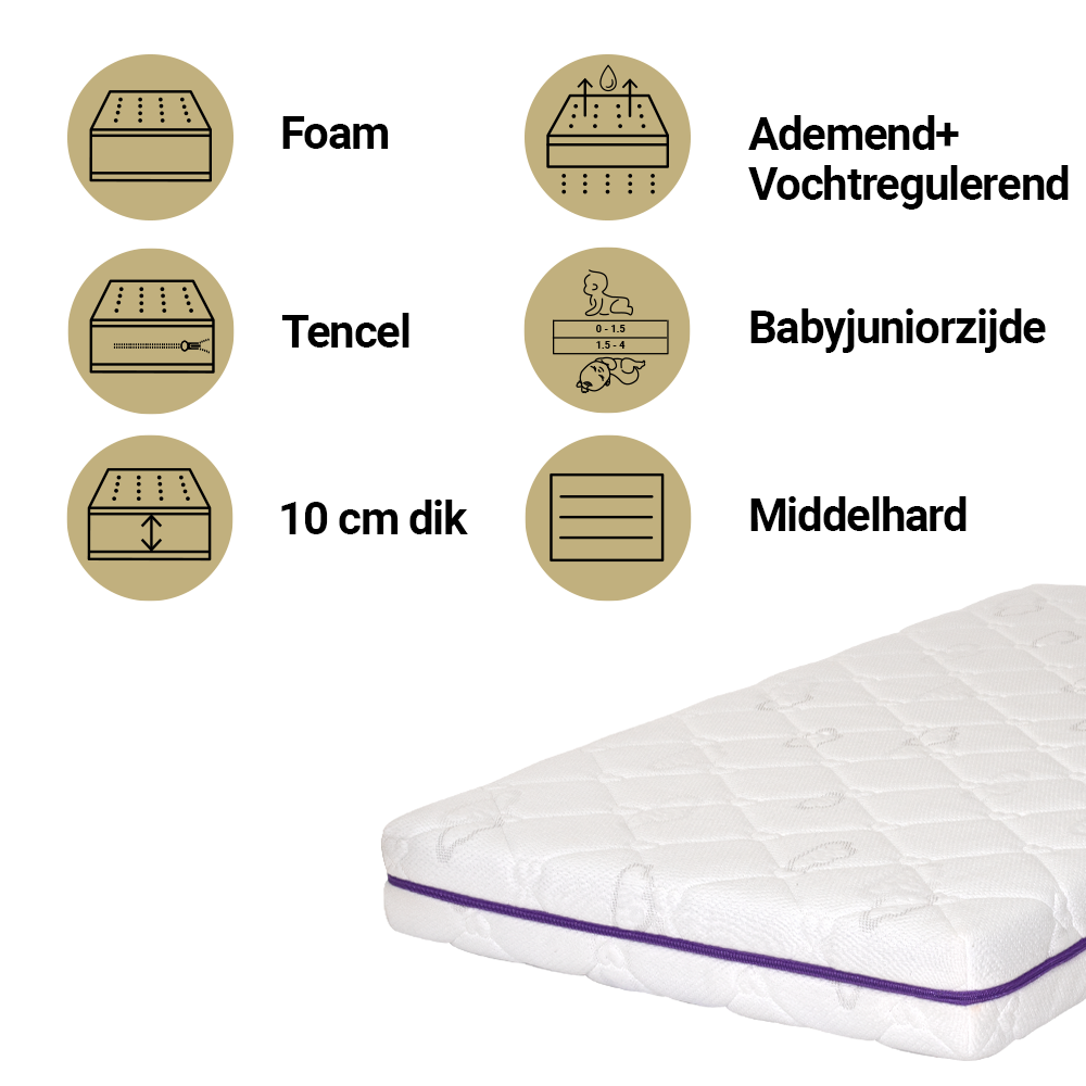 Träumeland Ocean matras Geventileerd matras voor een gezond slaapklimaat. Het Ocean matras van het merk Träumeland is geschikt vanaf de geboorte tot 4 jaar. Je kunt het matras vanaf 12 kg omdraaien van baby- naar kinderzijde. Het matras is gemaakt van comfortabel materiaal, waardoor je kindje heerlijk zal slapen. De veiligheidsranden op de lange zijden van het matras zorgen ervoor dat de baby op deze rand kan staan in het baby bed. Multifunctionele tijk’sleep safety’heeft een geïntegreerde bescherming tegen vocht. De matraskern blijft altijd droog en het vocht wordt geabsorbeerd op de oppervlakte. Vrijstaande 3D-comfortpads voor een perfecte ondersteuning van de baby’s ruggenwervel. Daarnaast heeft het matras een hypoallergene/anti-allergische werking. Het matras is voorzien van een afneembare en deelbare tijk. Matras Junior 70×140 Ocean T019019