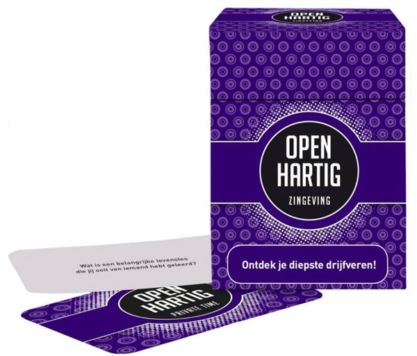 Verplichtingen kennen we allemaal. Voor je het weet gaat de ene dag ermee in de andere over. Toch kennen we ook allemaal de behoefte aan zingeving. De behoefte dat wat we doen in het leven ook waarde heeft. Vaak gaat dat niet over moeten, maar over wat goed en betekenisvol voor je voelt. Zingeving is voor iedereen anders. Maar wat en hoe kies je? Openhartig Zingeving prikkelt je om na te denken over dat wat jou inspireert en waar jij energie van krijgt. Met behulp van vragen uit verschillende invalshoeken haal jij naar boven waar jouw hart sneller van gaat kloppen. Het spel Openhartig Zingeving bevat vragen zoals bijvoorbeeld: – Wat is een belangrijke levensles die jij ooit van iemand hebt geleerd?- Waar was je als kind gepassioneerd over?- Welke medespeler is volgens jou heel zinvol bezig in zijn of haar leven? Leg uit waarom jij dat vindt.