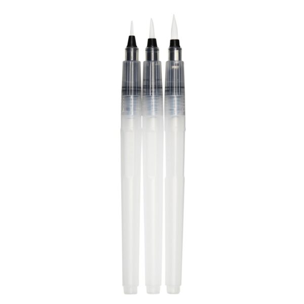 Waterbrushes zijn een van de meest handige toevoegingen aan je tools als je graag met aquarelverf of -potloden werkt. Omdat in de steel een waterreservoir zit, heb je een constante, gedoseerde toevoer van water tijdens het werken. Het water blijft schoon en spoelt het penseel tijdens het werken door. Hierdoor heb je dus altijd schone, perfect natte penseelharen. De penselen zijn fijn om thuis te gebruiken en onderweg (en op school!) al helemaal. Geen gehannes met lekkende potjes, maar gewoon een compact reissetje. Schroef het penseel open en vul het reservoir met water voor je weg gaat en je kunt aan de slag zodra de inspiratie toeslaat! Inhoud: 3 waterbrushes met fijne, medium en grote punt.