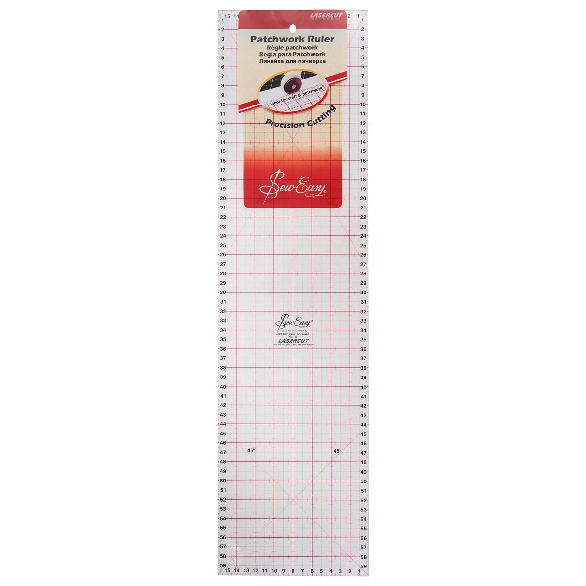 Patchwork liniaal met maataanduidingen in cm en verschillende hoeken erop staan. Afmeting: 60×16 cm.