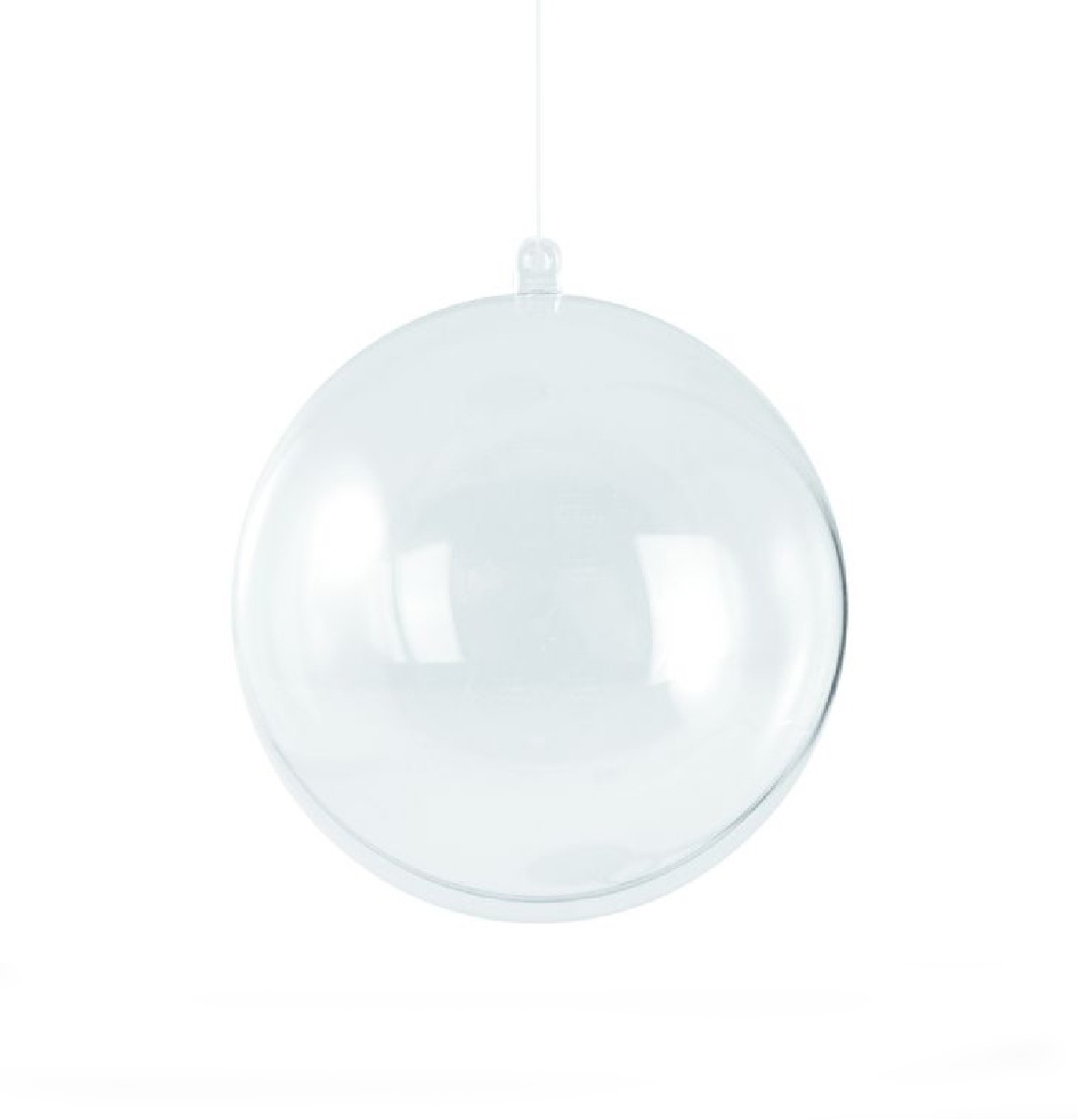 Transparante bal van 16 cm groot. Twee helften met een oogje aan de bovenkant om op te hangen. Om zelf te versieren.