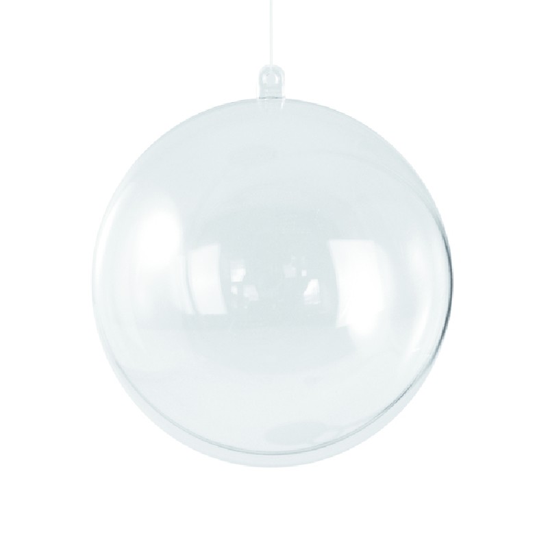 Transparante bal van 7 cm groot. Twee helften met een oogje aan de bovenkant om op te hangen. Om zelf te versieren.