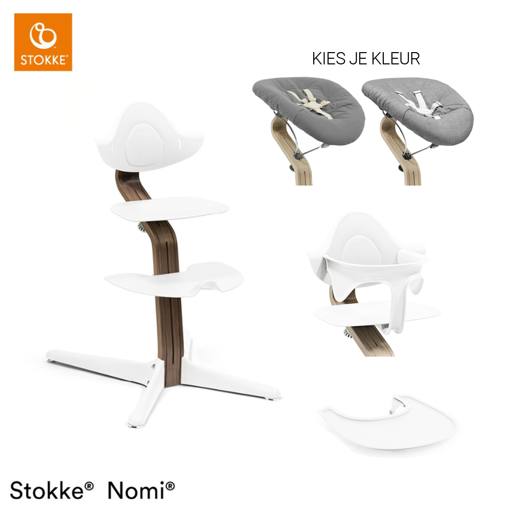Set Compleet | Kinderstoel Stokke® Nomi White/Walnut incl. Newbornset en Babyset en Eetblad