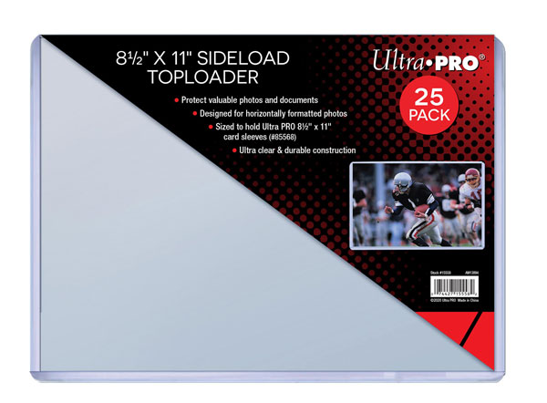 Side Load Toploader 215,9 x 279,4 mm (8-1/2″ x 11″). Keeps cards, photos and other collectibles clean, recyclable. 25 Toploaders per pack.Characteristics:- holds photos and other collectibles up to 8-1/2″ x 11″,- Sized to hold Ultra PRO 8-1/2″ x 11″ soft sleeves (#85568),- Protects valuable photos and documents,- Ultra clear,- Durable construction.