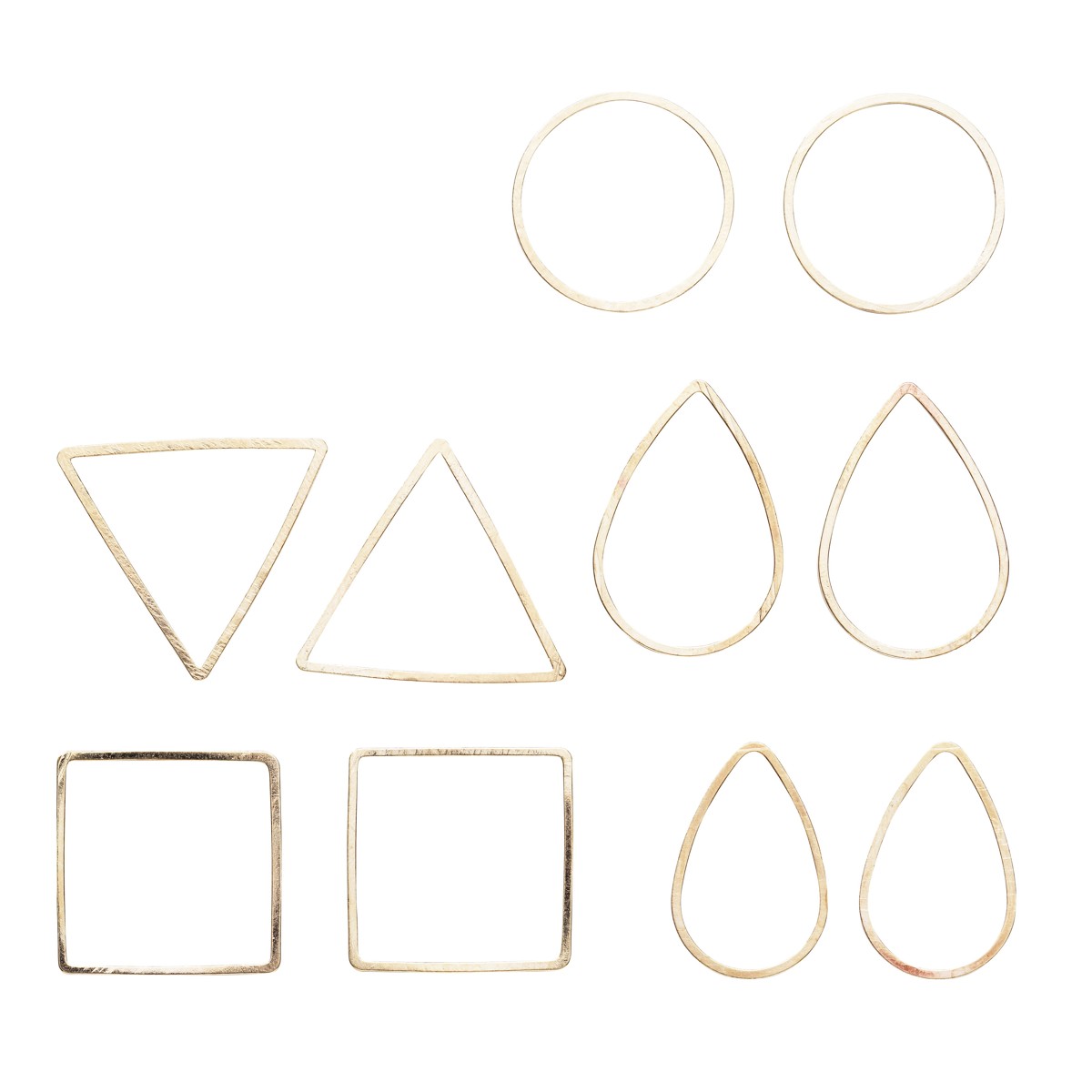 Leuke frames om te verwerken tot sieraden. Hang er kraaltjes aan of gebruik ze als basis voor giethars juweeltjes. De set bevat 5 soorten frames (2 per design), dus in totaal 10 stuks. Het kleine druppelvormige frame is 12×20 mm, het grote druppelvormige frame is 16×25 mm, het vierkante frame is 21×21 mm, het cirkelvormige frame is doorsnede20 mm en de driehoek heeft 24 mm lange zijden. Met een beetje creativiteit en de hulp van ons grote assortiment kun je snel aan de slag met het maken van sieraden en creëer je geheel eigen, unieke accessoires. De basis van de frames is van koper.
