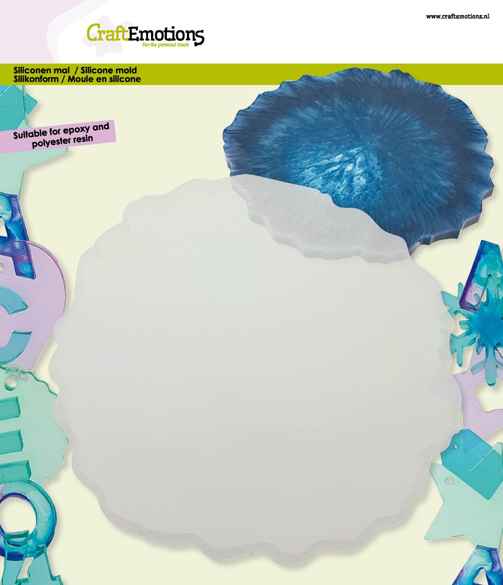 Deze siliconen gietmal is geschikt voor gebruik met epoxy en polyester giethars (ook voor bijvoorbeeld zeep en kaarsen trouwens!). De mallen van CraftEmotions zijn herbruikbaar en geven prachtig gladde afgietsels. De onderzetter in de vorm van een plak geode heeft een zogeheten“deckle edge”. Dankzij deze grillige afwerking, heeft hij een natuurlijke uitstraling. De onderzetter is 12,5-13 cm breed en ongeveer 1 cm dik.Hoe gebruik je de mal? Zorg dat je een vlak, glad en goed beschermd werkoppervlak hebt voor je begint. Meng de giethars/epoxy zoals op de verpakking staat beschreven (met eventuele toevoegingen) en giet de hars voorzichtig in de mal. Let daarbij op de aangegeven voorzorgsmaatregelen op de giethars verpakking. Na drogen (48 uur) zijn de afgietsels eenvoudig te verwijderen uit de siliconen gietmal. De mal kan gereinigd worden met plakband (uitgeharde stukjes), azijn, alcohol of aceton.