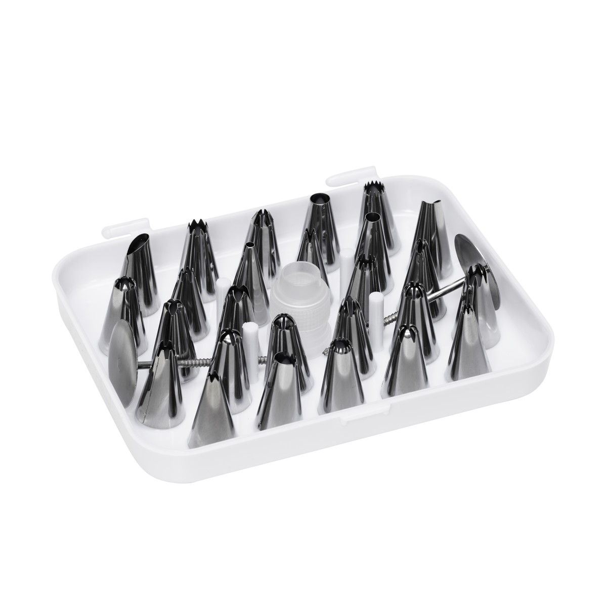 Uitgebreide set van 26 spuitmondjes + 2 bloemennagels, voor degenen die hun bakkunsten echt naar een hoger niveau willen tillen! Geef cupcakes en taarten net dat beetje extra, waarbij de icing, frosting of botercrĆØme prachtige patronen en details vormen. De set bevat in totaal 26 roestvrijstalen spuitmonden met verschillende openingen, 2 bloemennaalden die gemakkelijk vast te houden en te draaien zijn terwijl je er bloemen op spuit en tot slot een 2-delige houder waarmee je de spuitmondjes op een spuitzakkunt bevestigen en tussendoor kunt wisselen. Geleverd in een praktisch kunststof koffertje.