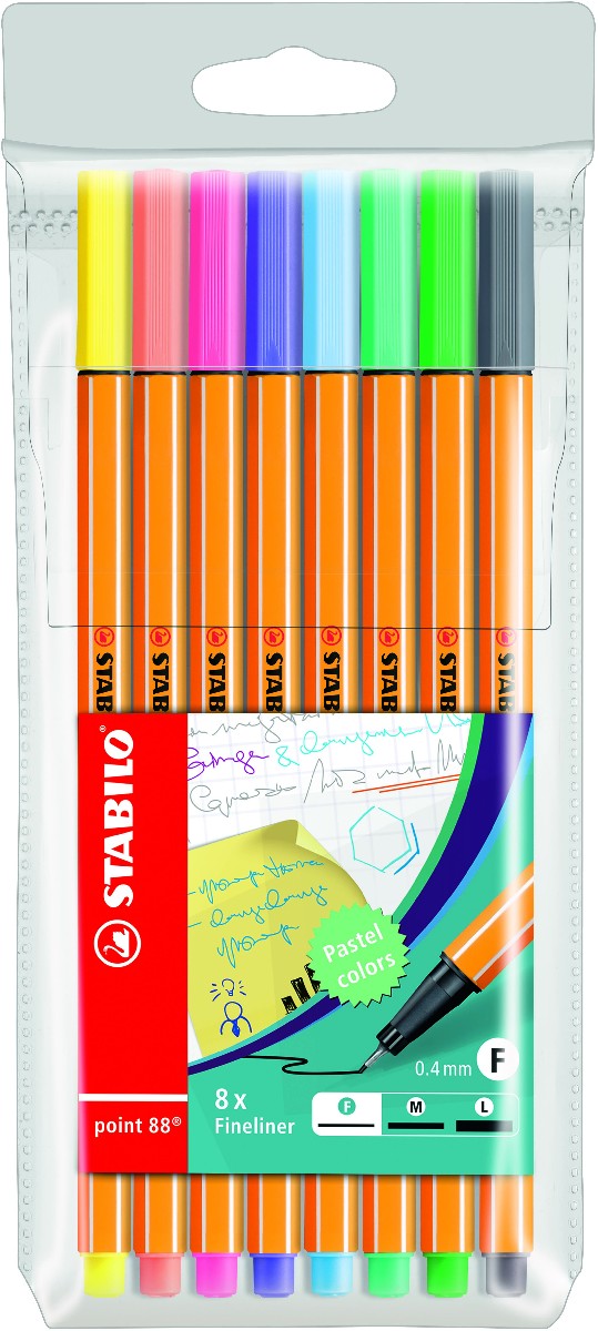 De bekende STABILO Point 88 is nu ook verkrijgbaar in een set met 8 pasteltinten. De vertrouwde kwaliteit in eigentijdse kleuren! Leuk om mee te schrijven, kleuren, handletteren en meer…
