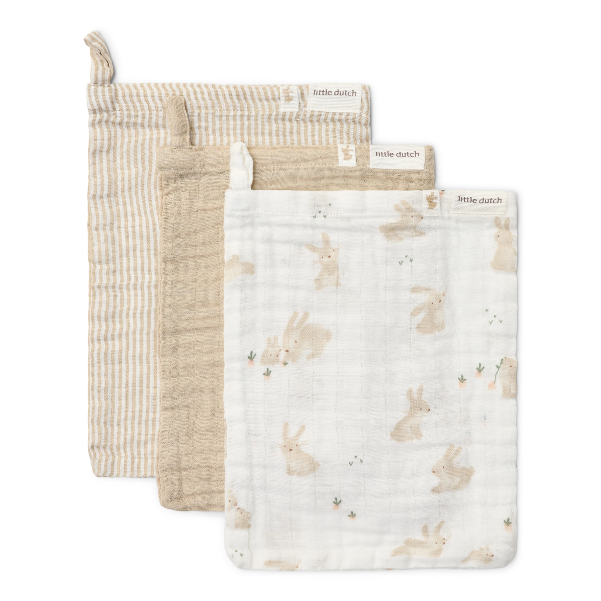 Washandjes Little DutchDe set van 3 washandjes van uit de Baby Bunny collectie van Little Dutch zijn ideaal voor de fijne badmomenten met je kindje. De washandjes zijn van hydrofiele stof, zijn heerlijk zacht en fijn voor de gevoelige huid van je kindje. De set bestaat uitéén washandje in een effen beige kleur, één wit/beige gestreepte en één met een print van konijntjes. EigenschappenMerk: Little DutchMateriaal: 100% hydrofiel biologisch katoenAfmetingen: 21×14 cmWasbaar op 40 graden3 stuks