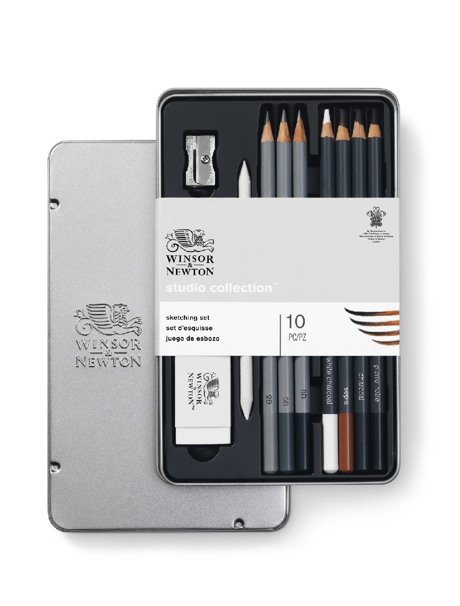 Ontdek het plezier van traditioneel tekenen en schetsen met deze zorgvuldig geselecteerde set met essentiële potloden en gereedschappen. De klassieke houtskool- en grafietpotloden kunnen gemakkelijk worden gemengd om suggestieve schaduwen te creëren, waardoor ze ideaal zijn voor opvallende portretten en stillevens. Deze hoogwaardige potloden zijn veelzijdig en responsief en perfect voor spontaan schetsen. Leg snel beweging kunt vast en probeer nieuwe ideeën kunt uit! Inhoud: Grafietpotloden in de hardheden 2B, 6B en 8B + houtskoolpotloden in de kleuren wit en sepia en een medium en hard houtskoolpotlood met een zwarte kleur. Daarnaast nog een blender, gum en puntenslijper. Dit alles verpaktin een handig en stevig blik, die je potloden op hun plek houdt tijdens het vervoeren en ze beschermt tussen gebruik door.