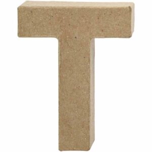 Dit is een letter T. Deze letter is gemaakt in papier-mâché. Ze is 10 cm hoog en 2 cm dik