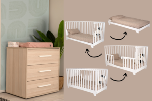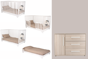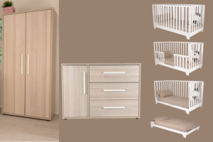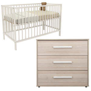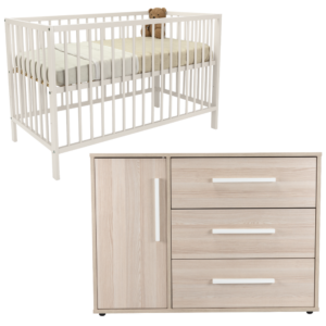Babykamer Timo (Meegroeiledikant Luca + Commode) Babykamer Timo is een klassieke babykamer met strakke meubels, voorzien van houtkleurige handgrepen. Meegroeiledikant Laat